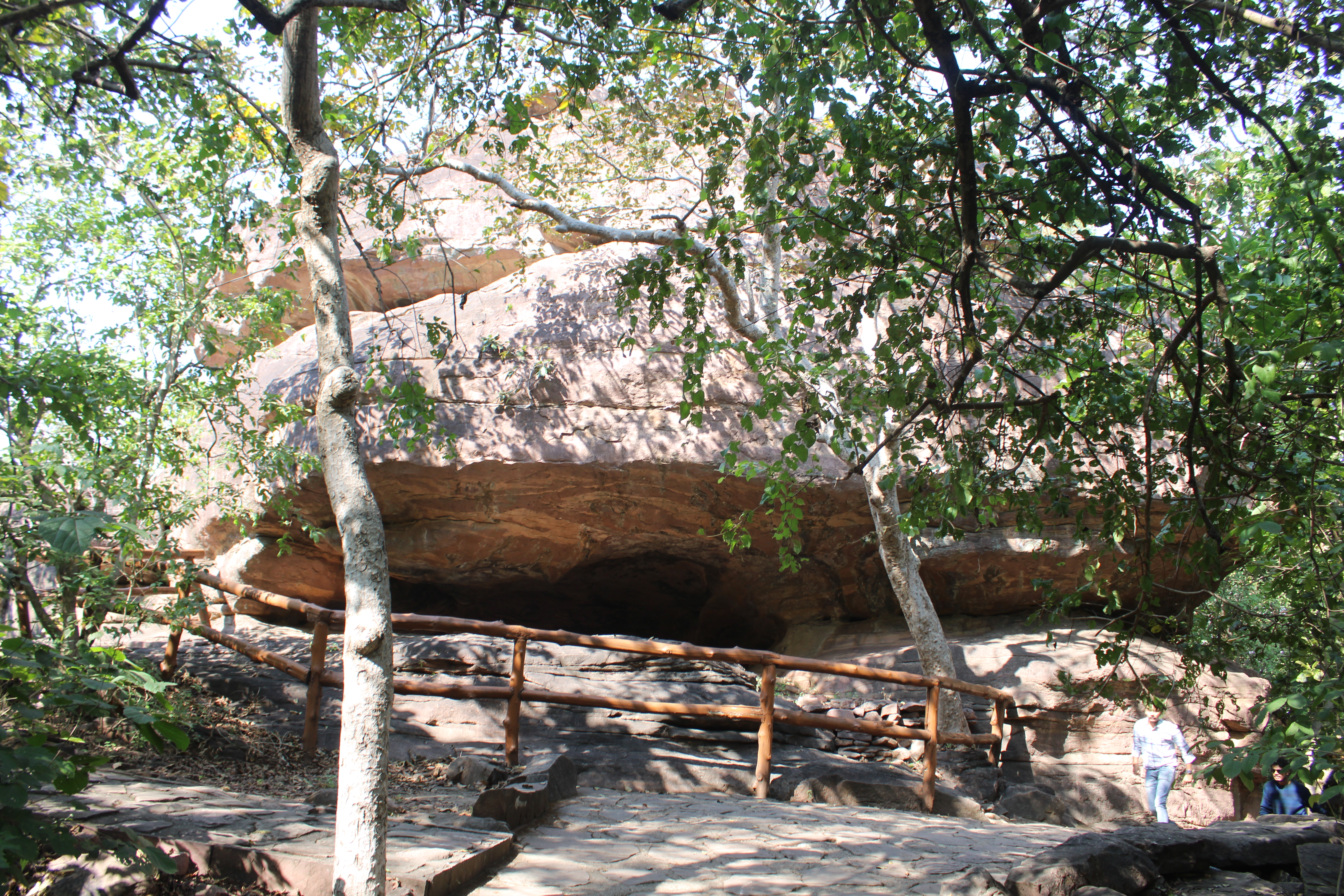 The Rock Shelters of Bhimbhetka are in the foothills of the Vindhya Mountains. Within massive sandstone outcrops, above comparatively dense forest, are five clusters of natural rock shelters, displaying paintings that appear to date from the Mesolithic Period right through to the historical period.