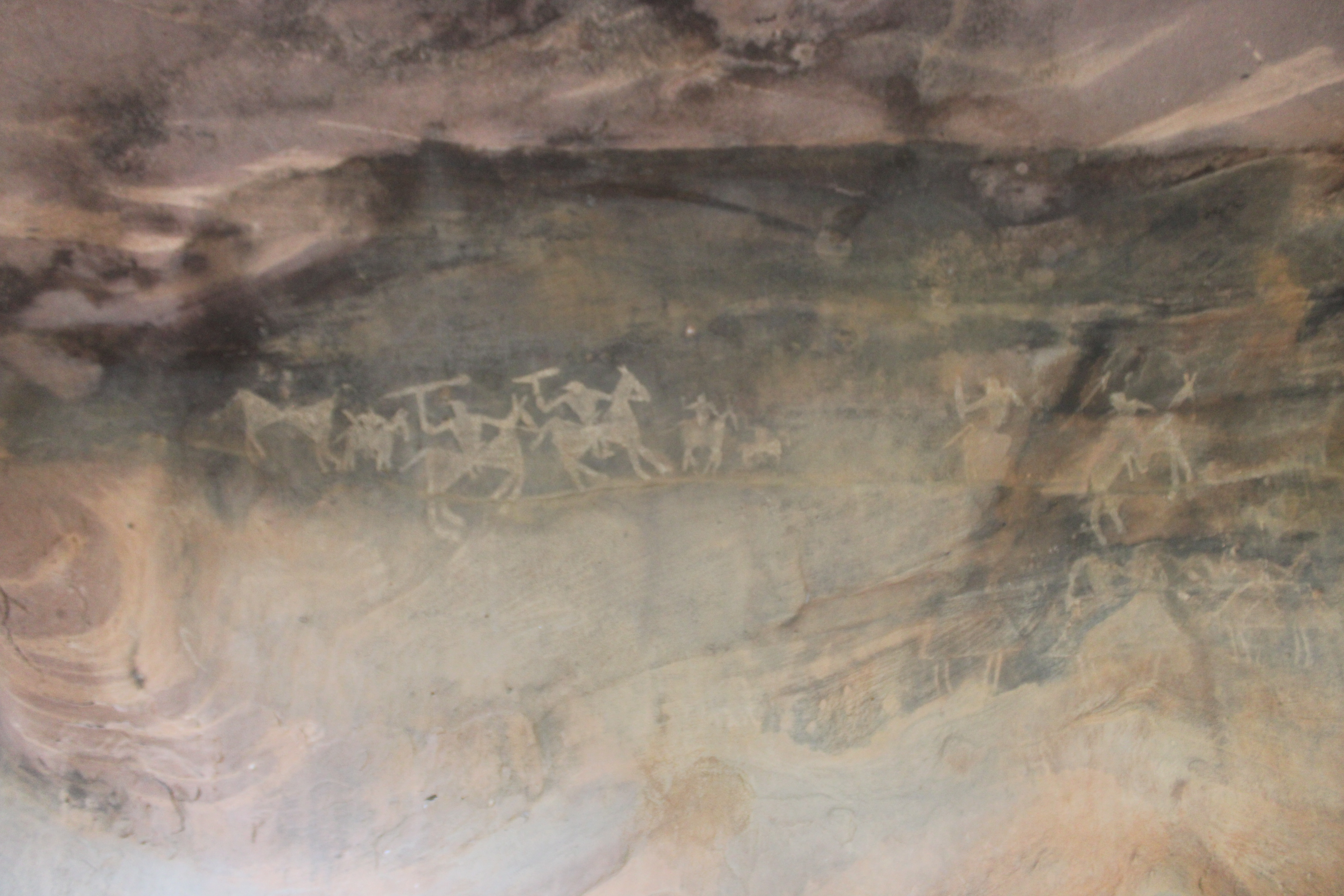 Bhimbetka is closely associated with a hunting and gathering economy as demonstrated in the rock art. The paintings are mainly executed in red & white with occasional use of green & yellow with themes taken from the everyday events of that age. These paintings cover the period from the lower Paleo-lithic times up to the medieval period.